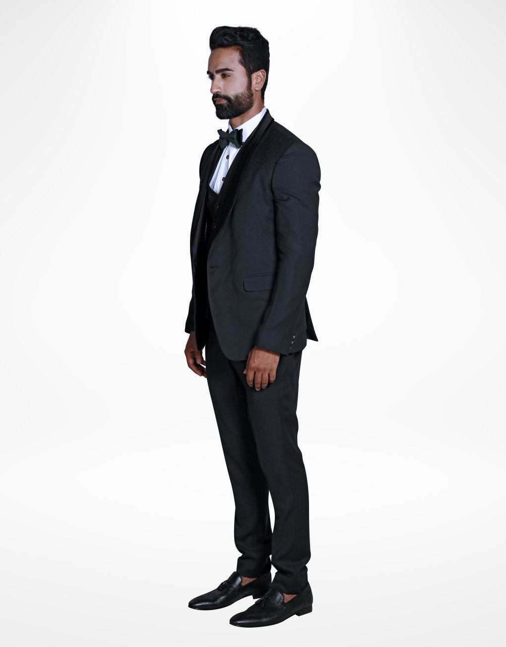 Feel regal in this bottle green suit set, shaped with imported TR fabric. This outfit is perfectly packaged as 5 piece suit set, with royally textured fabric, the black hand bead work adds to the mysticity of this outfit. Wear this classy armour and be a knight of a solemn night.