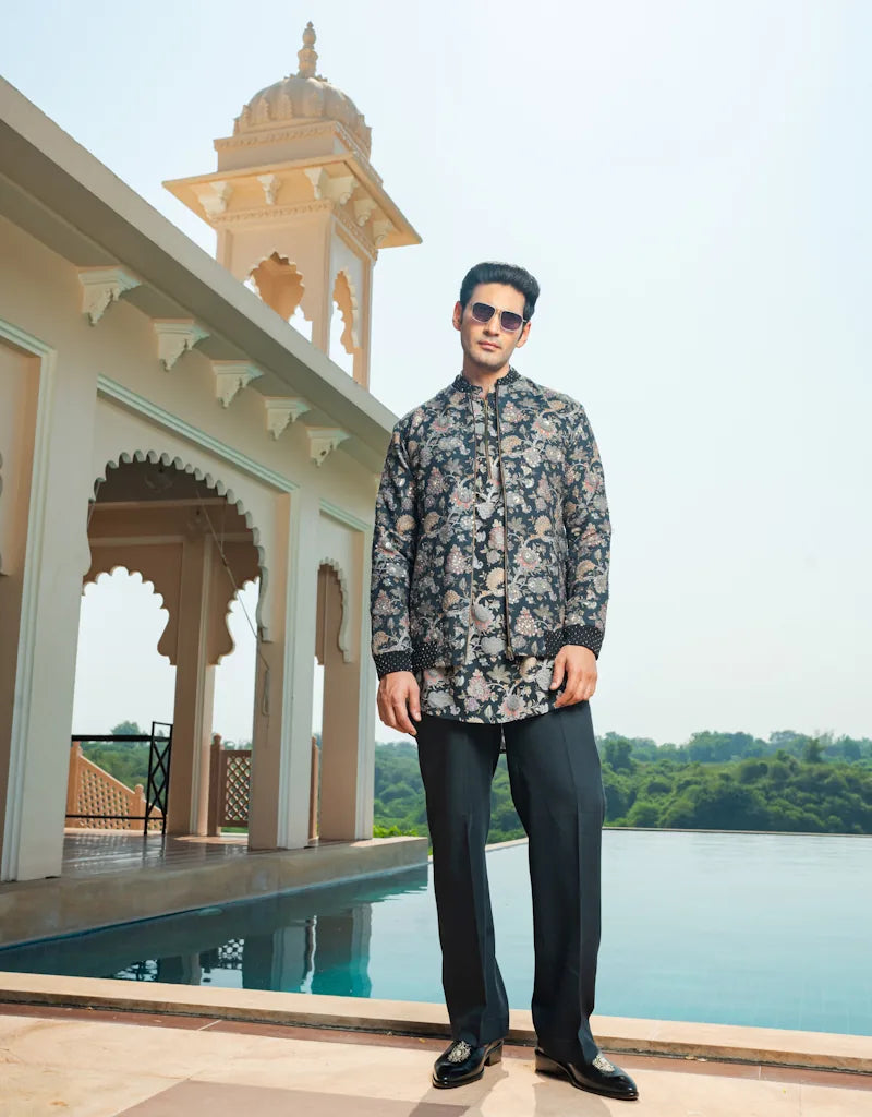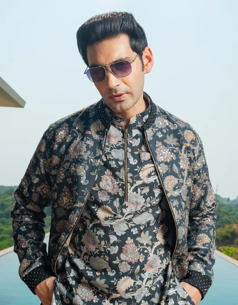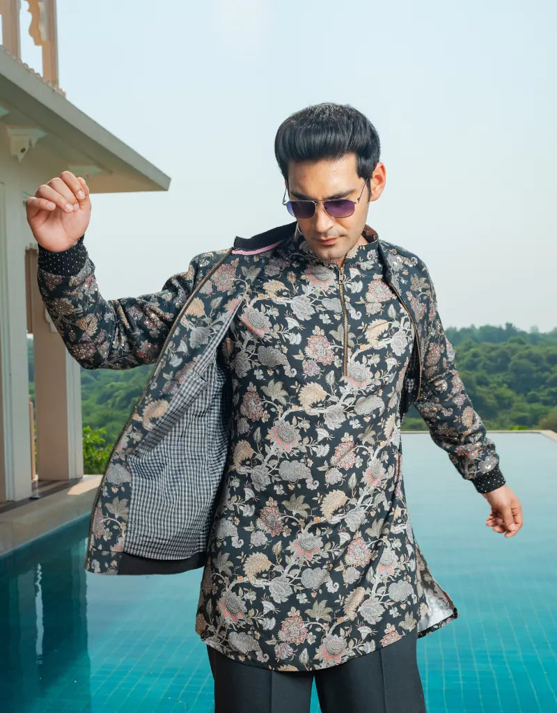Introducing our exquisite Men’s Floral Kurta with Dark Tone Bomber Jacket, a sartorial masterpiece that is the epitome of elegance and sophistication. This piece is designed for the discerning gentleman who appreciates the allure of classic patterns infused with a modern sensibility. The ornate design, rich in detail, exudes luxury and is sure to make a bold statement at any event.