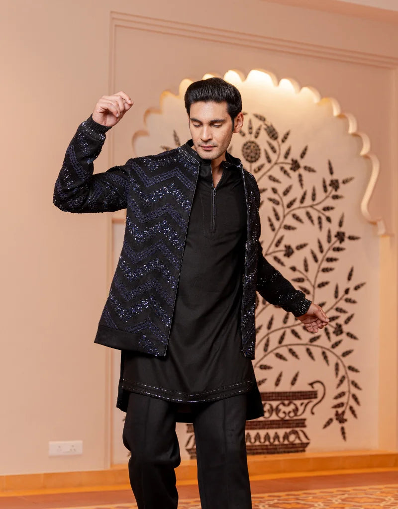 Introducing our sleek and modern black bandhgala jacket ensemble, the pinnacle of contemporary elegance. This meticulously crafted piece is designed for the discerning man who wants to make a bold statement with his wardrobe. The Indo-Western embroidery features an intricate, geometric pattern that adds a layer of depth and sophistication to the overall design, perfect for a night of celebration or a high-profile event.