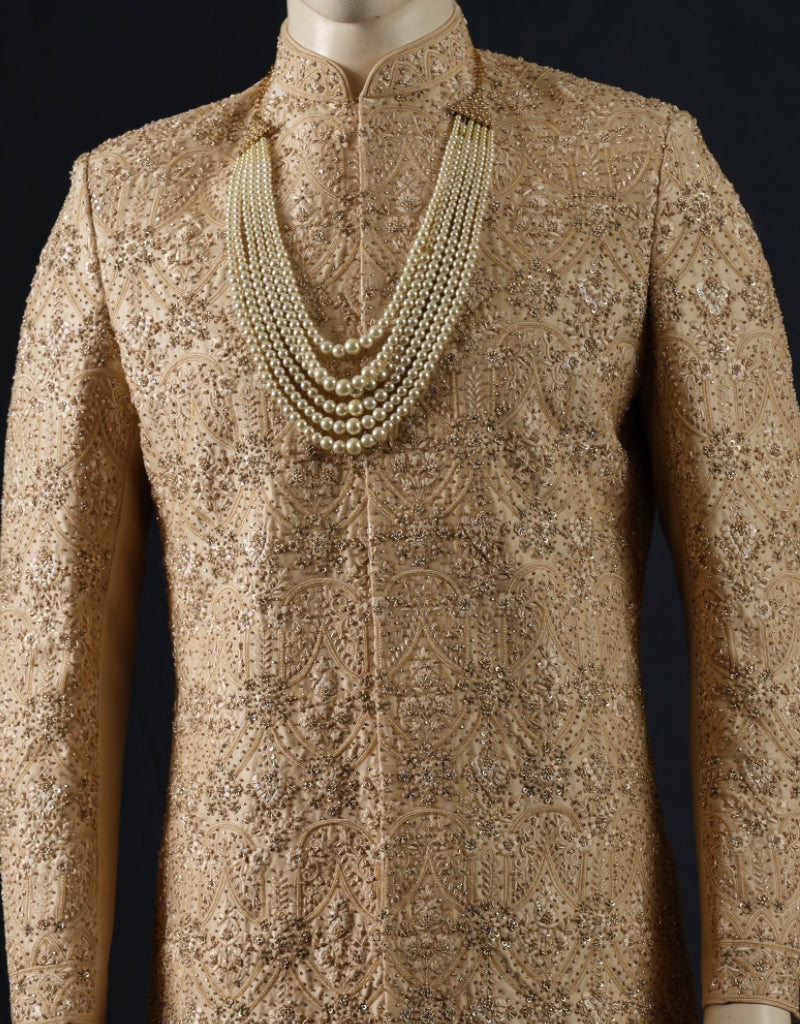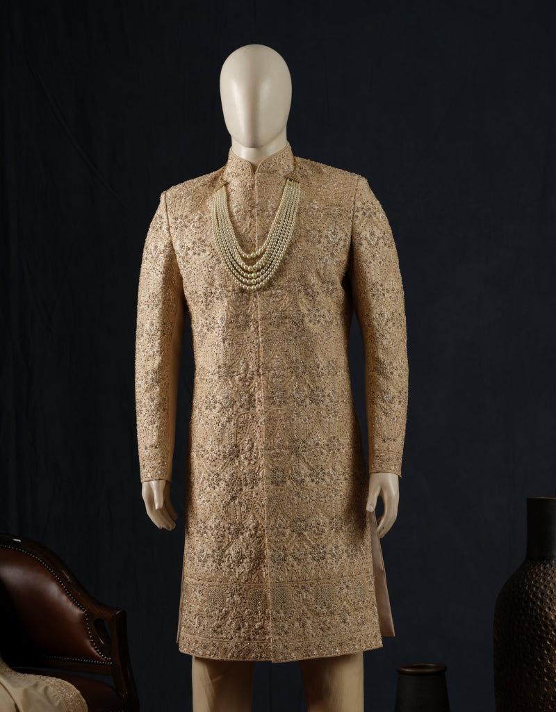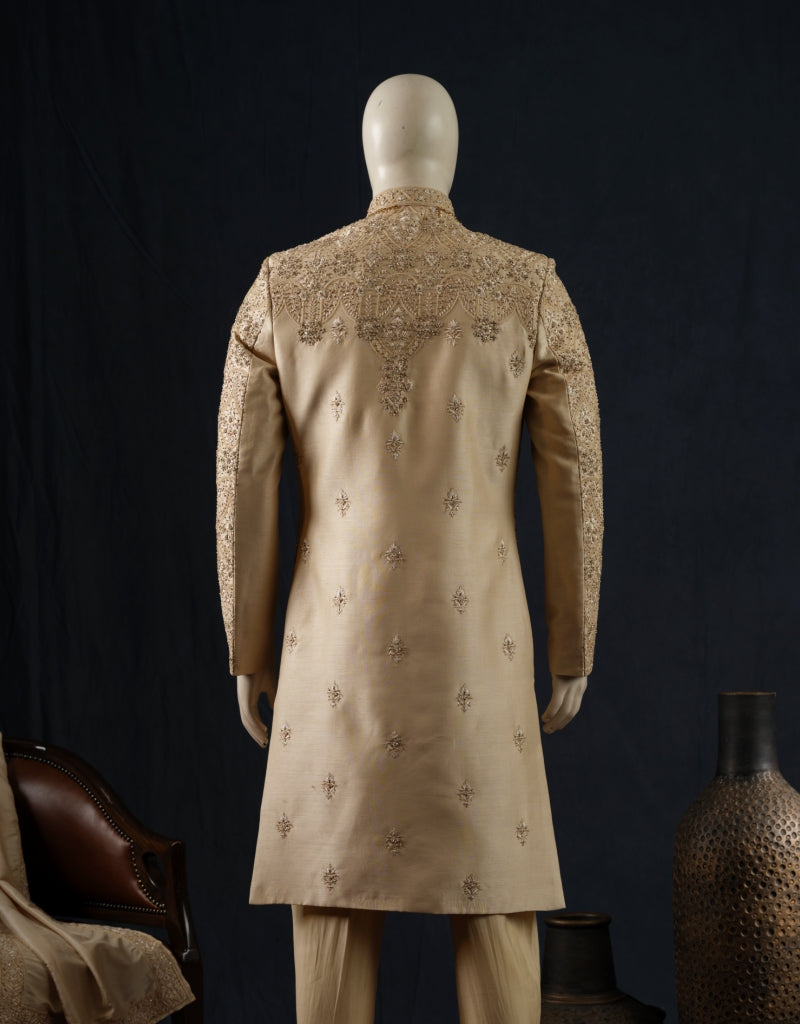 Crafted with exquisite craftsmanship, this gold embroidered sherwani radiates grandeur and grace, making it an impeccable choice for events.