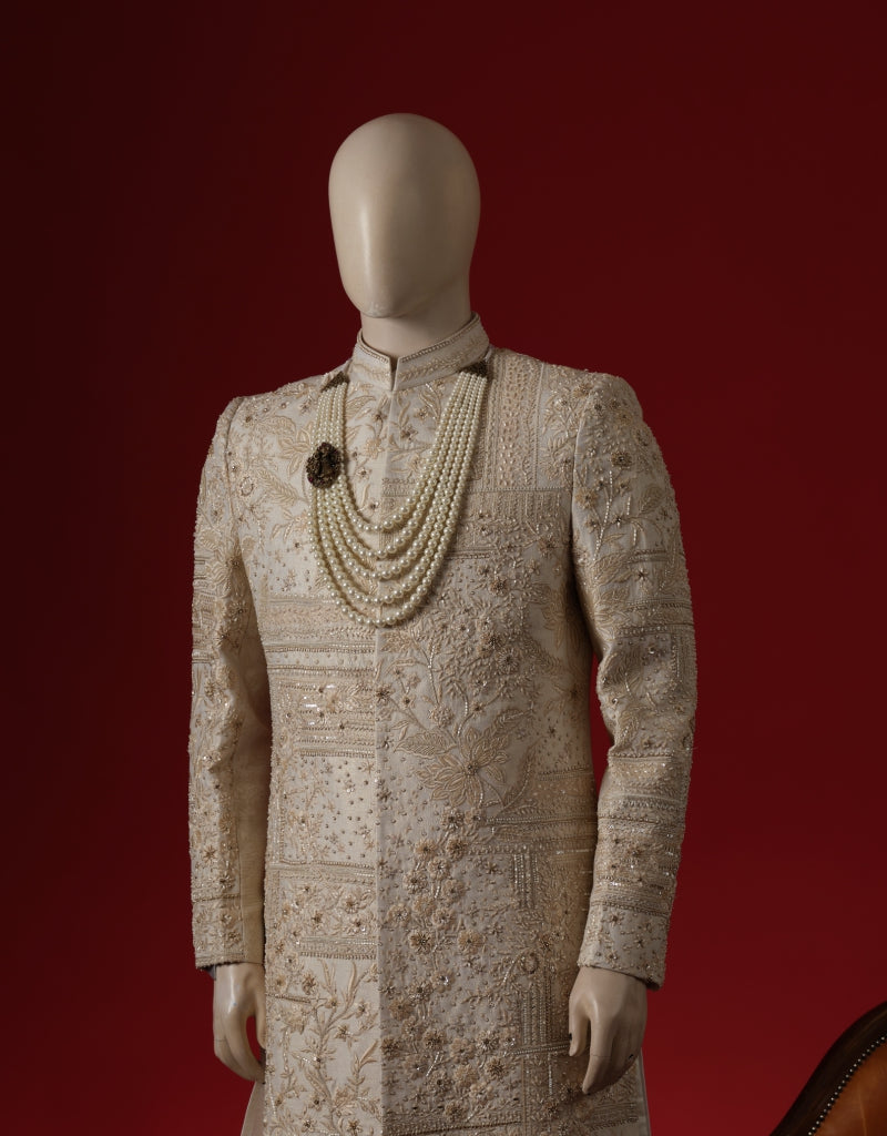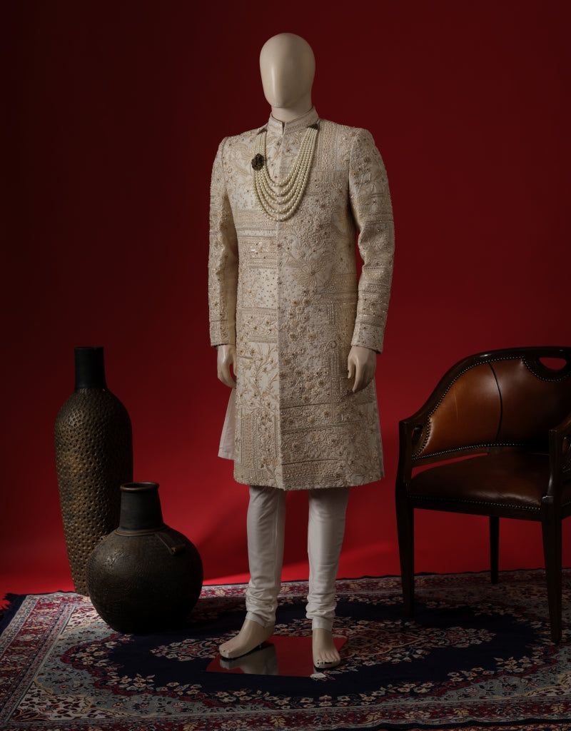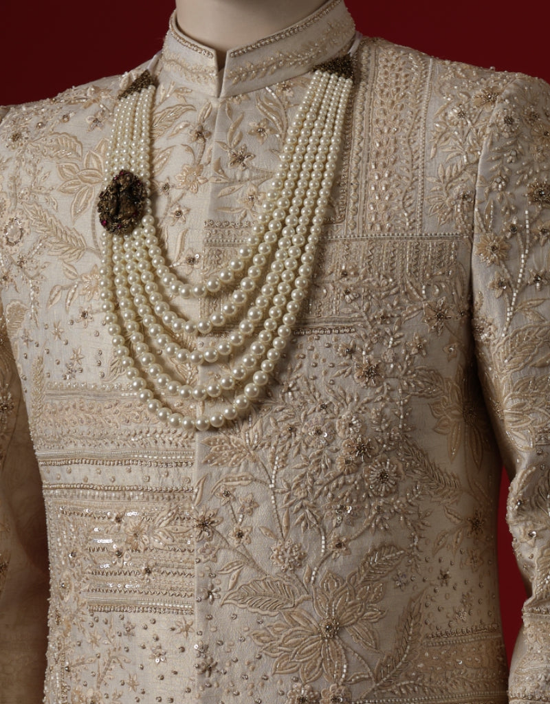 Step into opulence with this classic beige ensemble, adorned with intricate, heavy embroidery that exudes timeless charm.