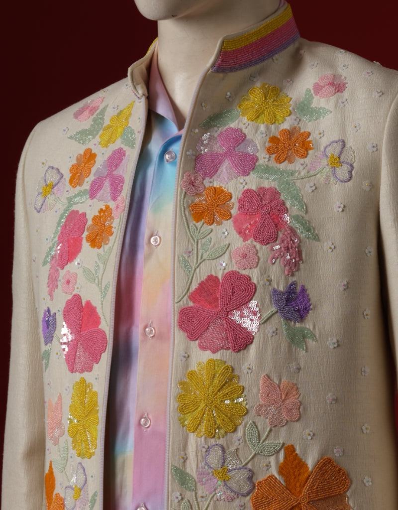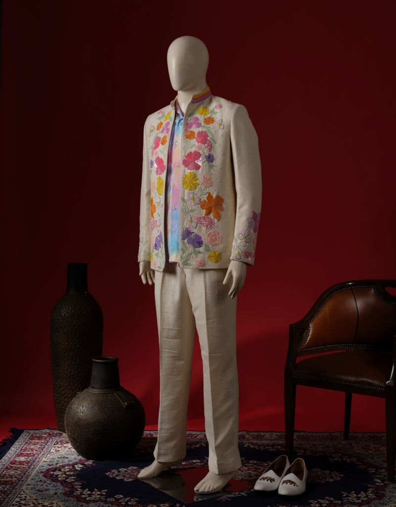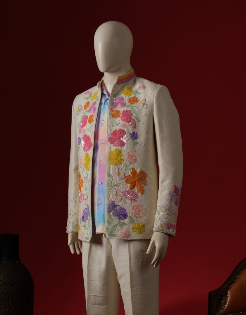 This intricately designed ensemble, adorned with vibrant floral work on a pristine white base, offers a graceful blend of tradition and contemporary flair.