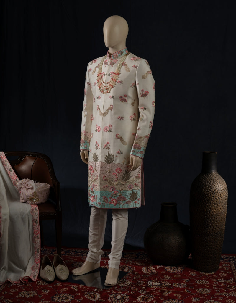 Drape yourself in sophistication with this beige sherwani, featuring delicate floral elements inspired by nature.