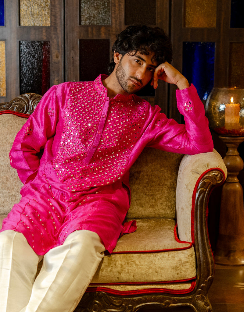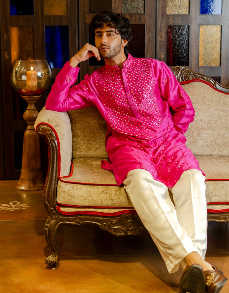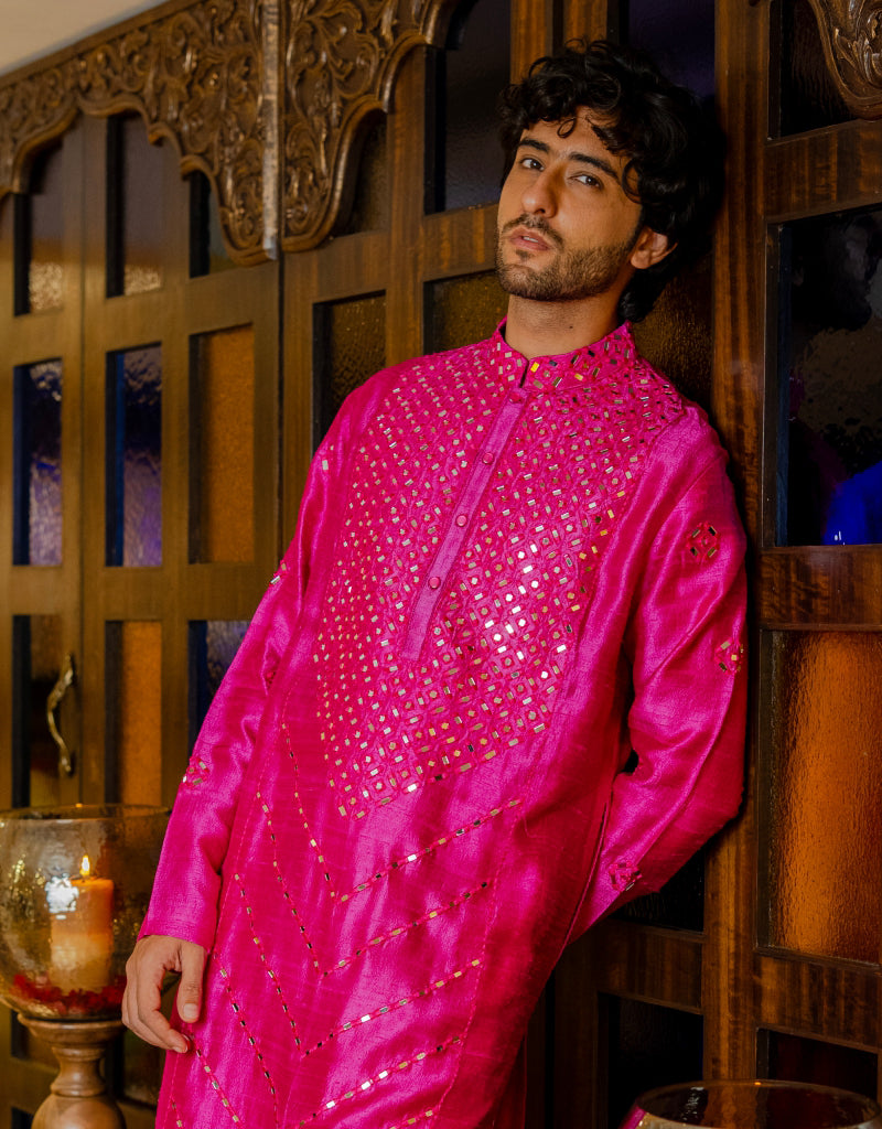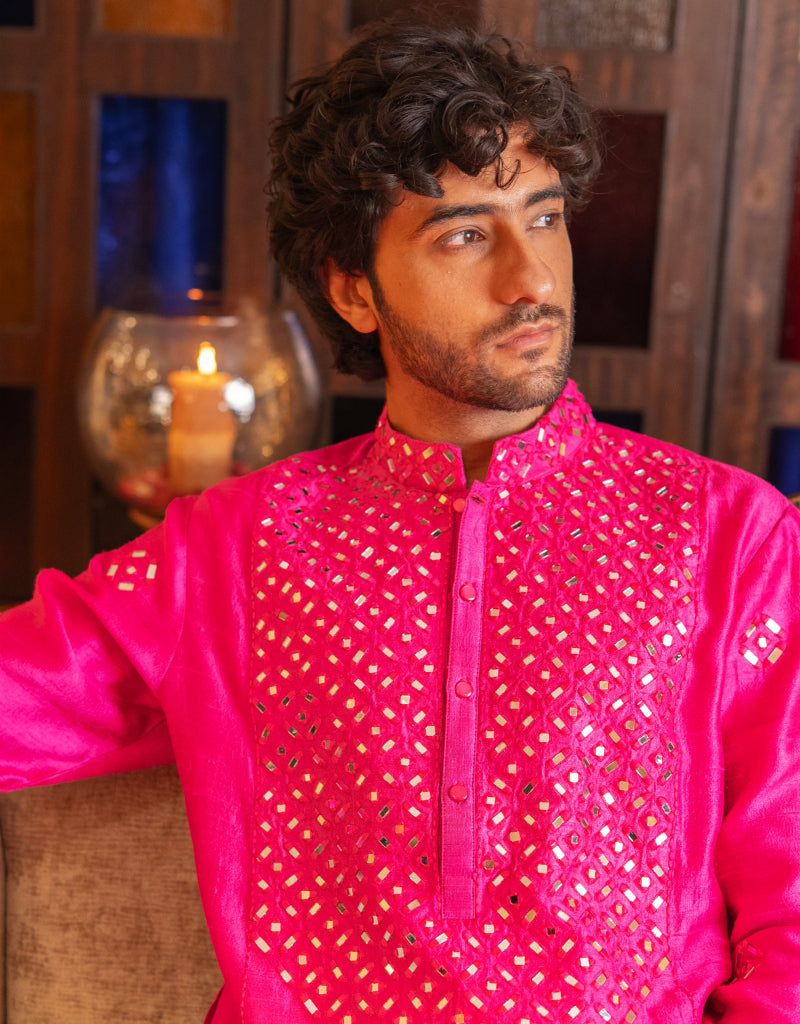 A dazzling fuchsia pink kurta with mirror work detailing, crafted for moments that call for brilliance.