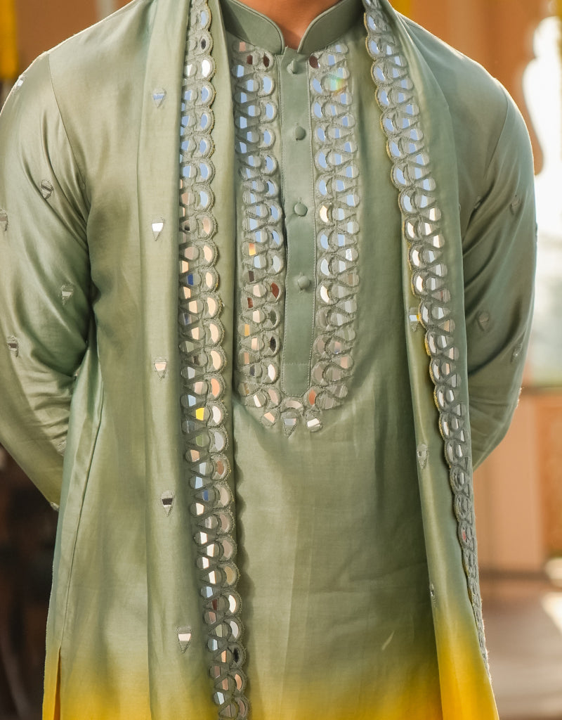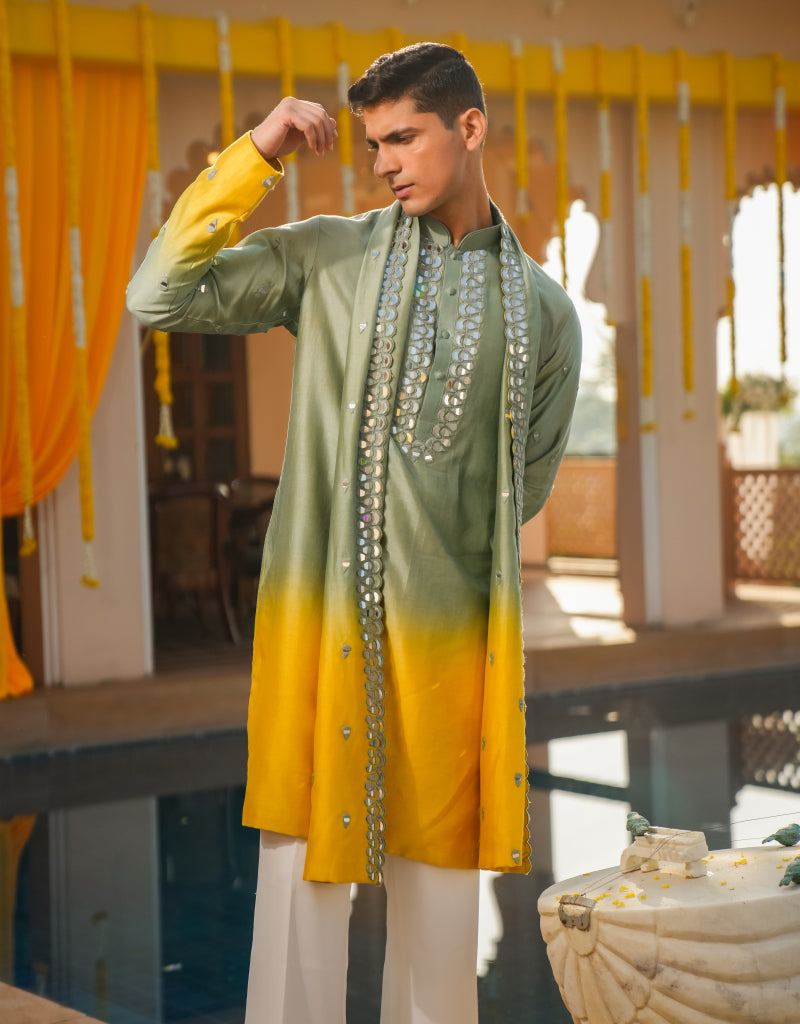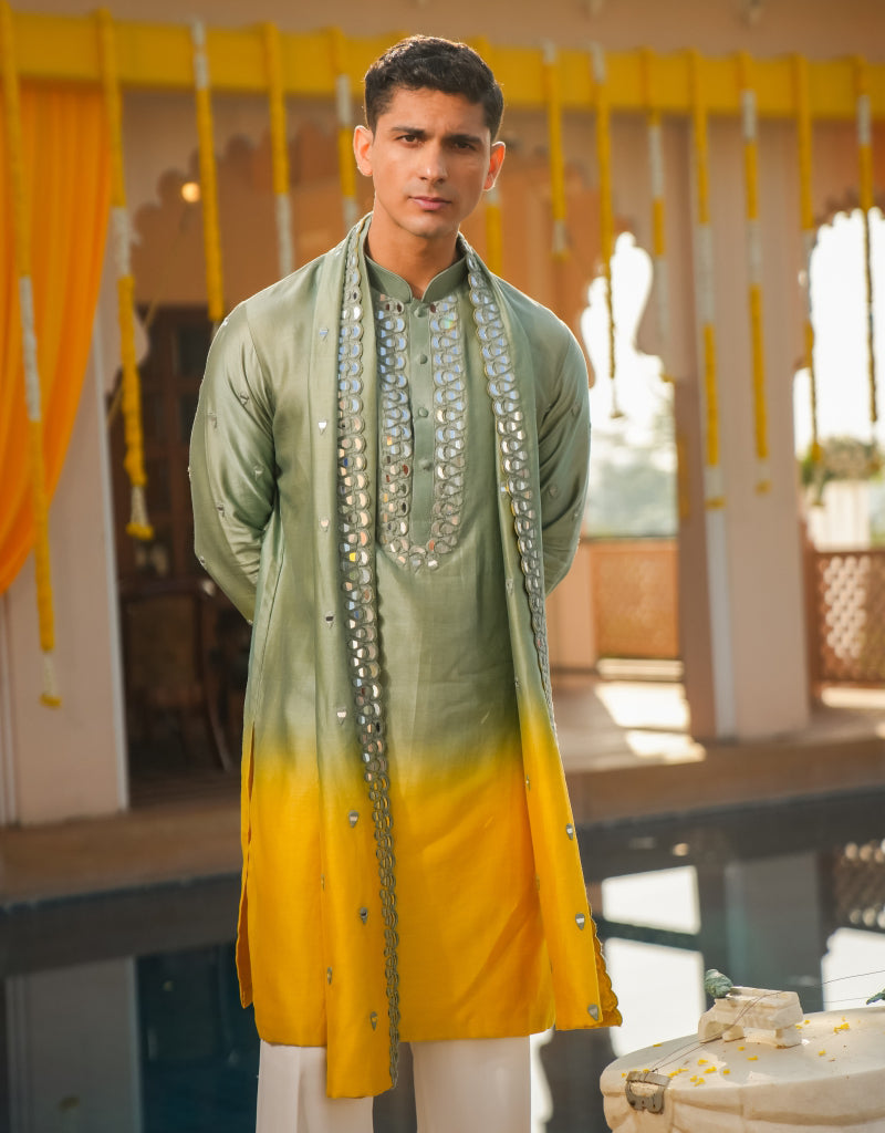 A stylish ombre kurta set blending sage green to mustard yellow, elevated with handcrafted mirror work and a coordinated stole for a refined festive look.