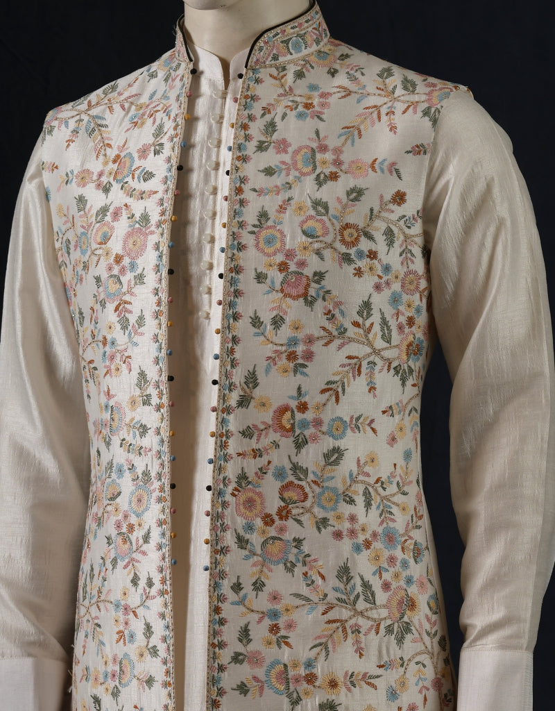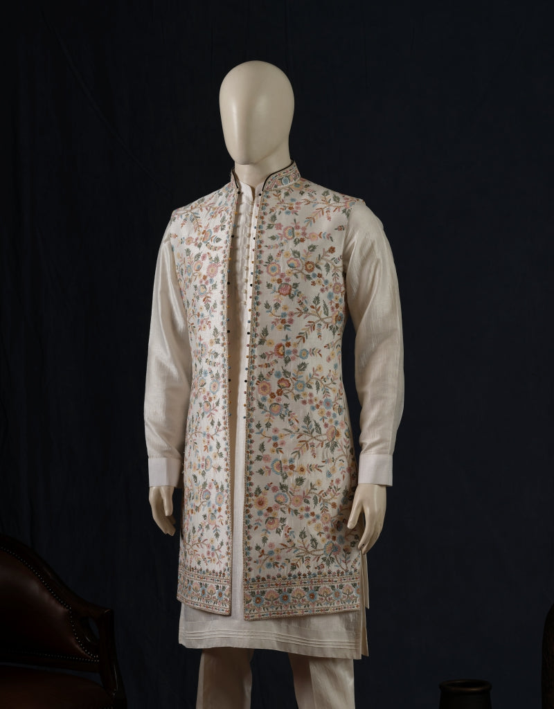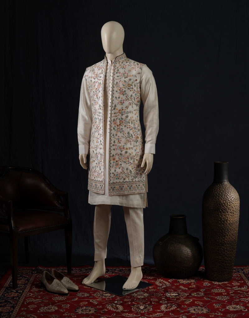 An ivory ensemble paired with a floral embroidered Nehru jacket, crafted with intricate detailing and subtle tones. Designed for festive occasions, a look that speaks of quiet sophistication.
