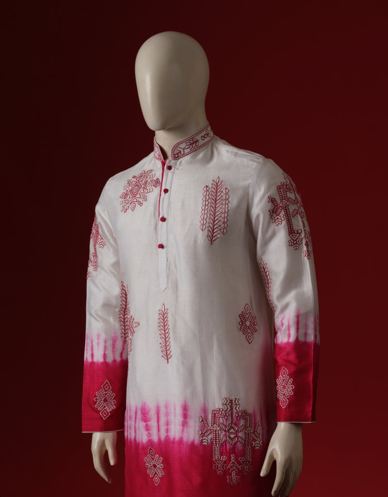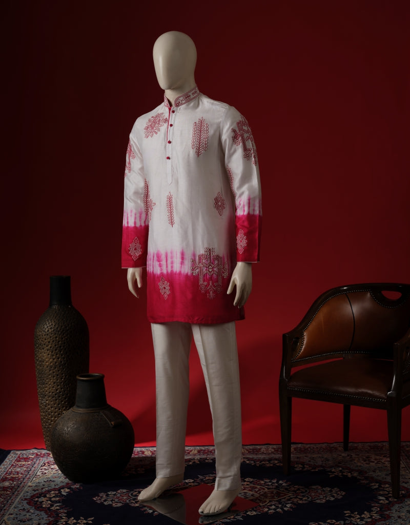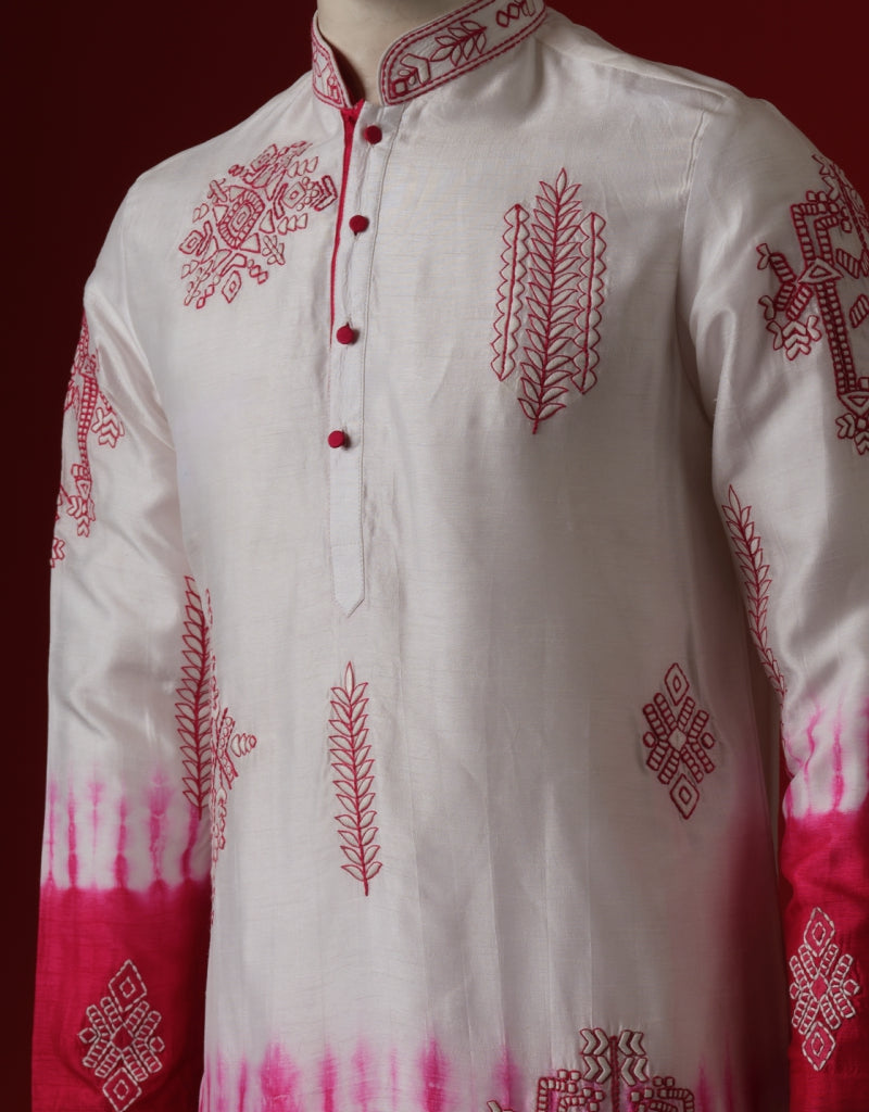 An ivory-red embroidered kurta with handcrafted detailing and dip-dye finish, ideal for celebrations with a touch of color and charm.