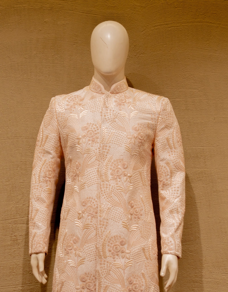 With intricate ivory embroidery, this sherwani brings together the finest traditions with a noble, regal presence that speaks volumes.