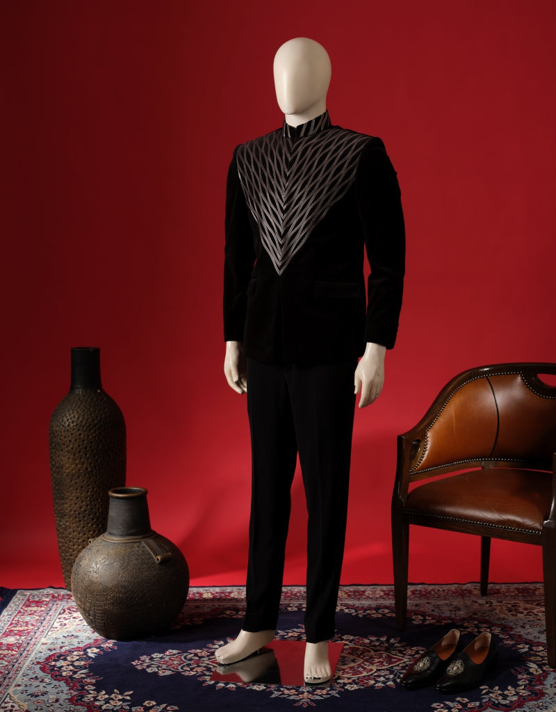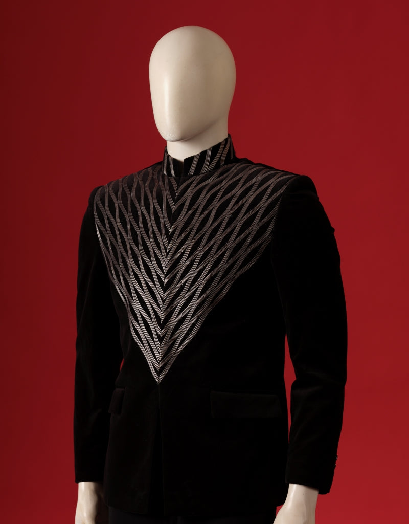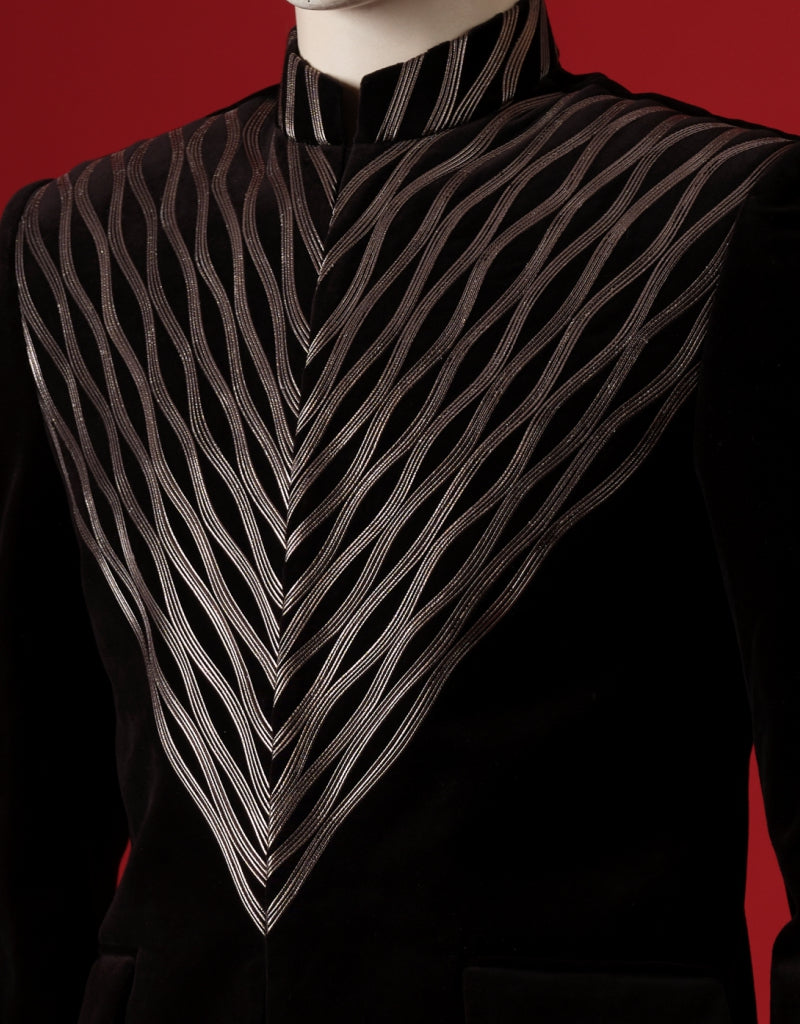 Featuring exquisite silver detailing, this black coat presents a stunning blend of sophistication and modern style.