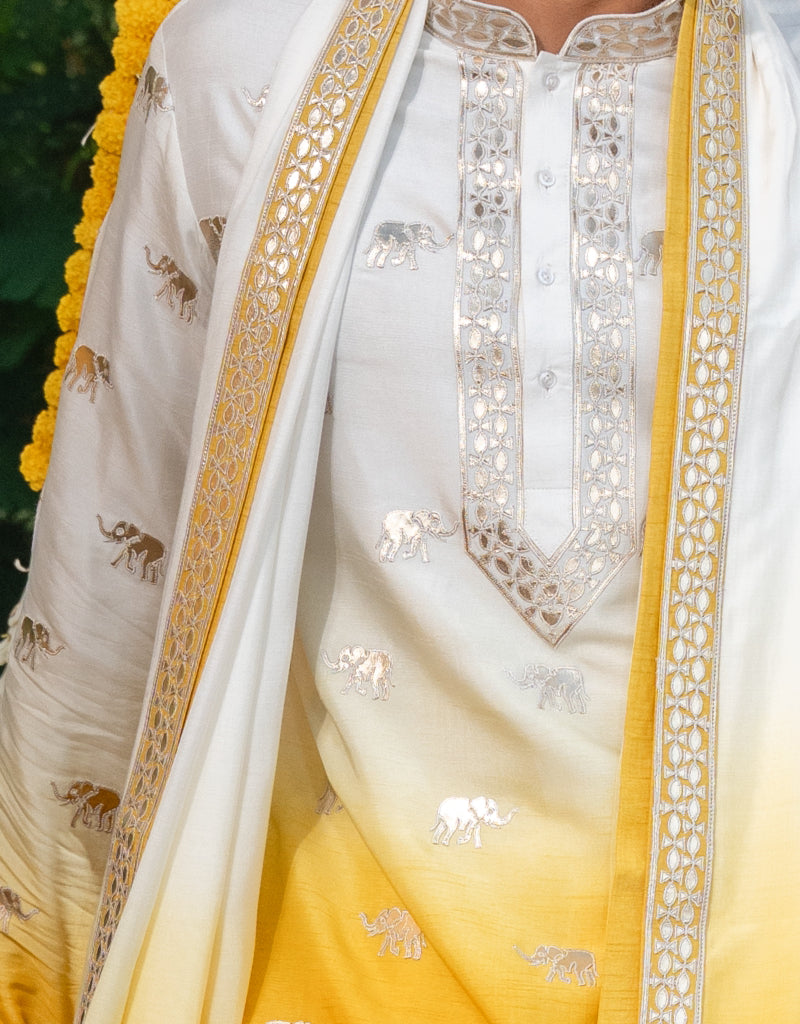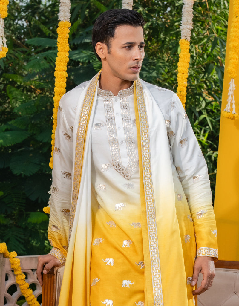 An elegant ombre silk kurta transitioning from soft ivory to vibrant yellow, adorned with delicate elephant motifs and rich metallic border detailing for a striking festive statement.