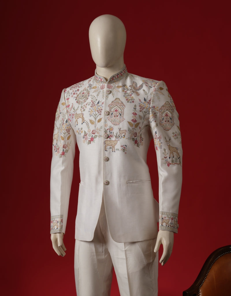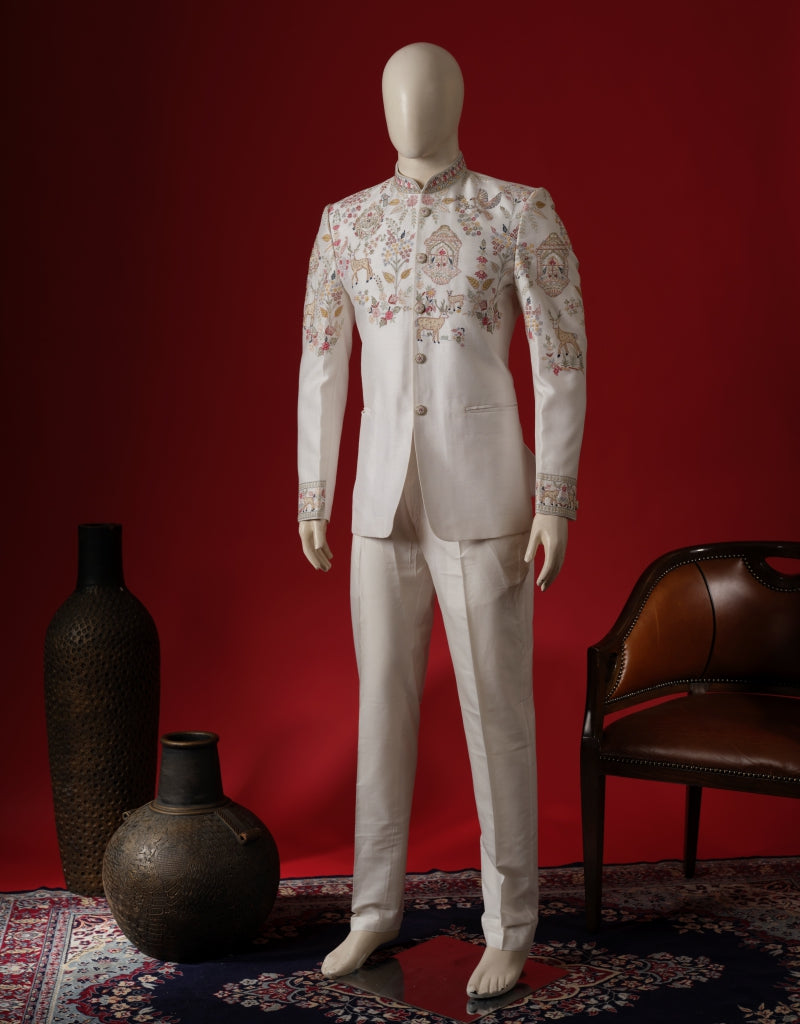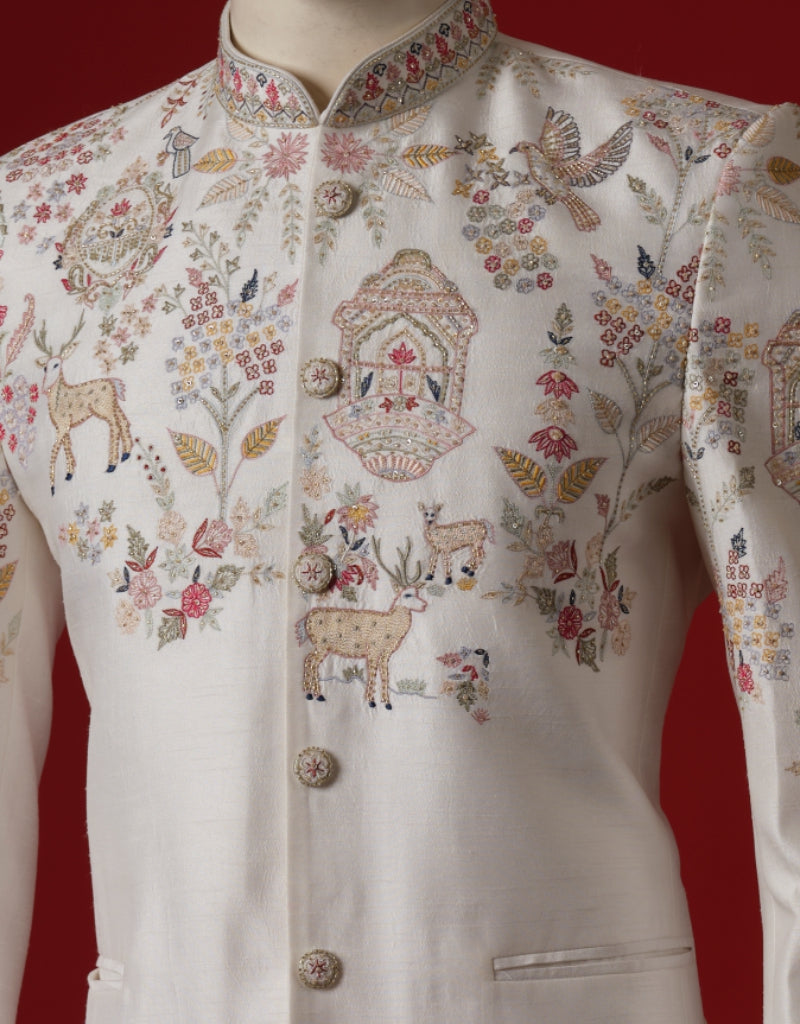 Ivory bandhgala featuring fine thread embroidery in delicate hues. A modern take on traditional elegance for festive and formal occasions.