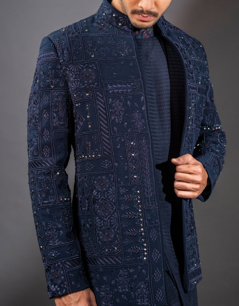 Embroidered in geometric patterns, this 3-Piece Indo-western from The HUB’s new collection presents classic silhouettes and weaving techniques.