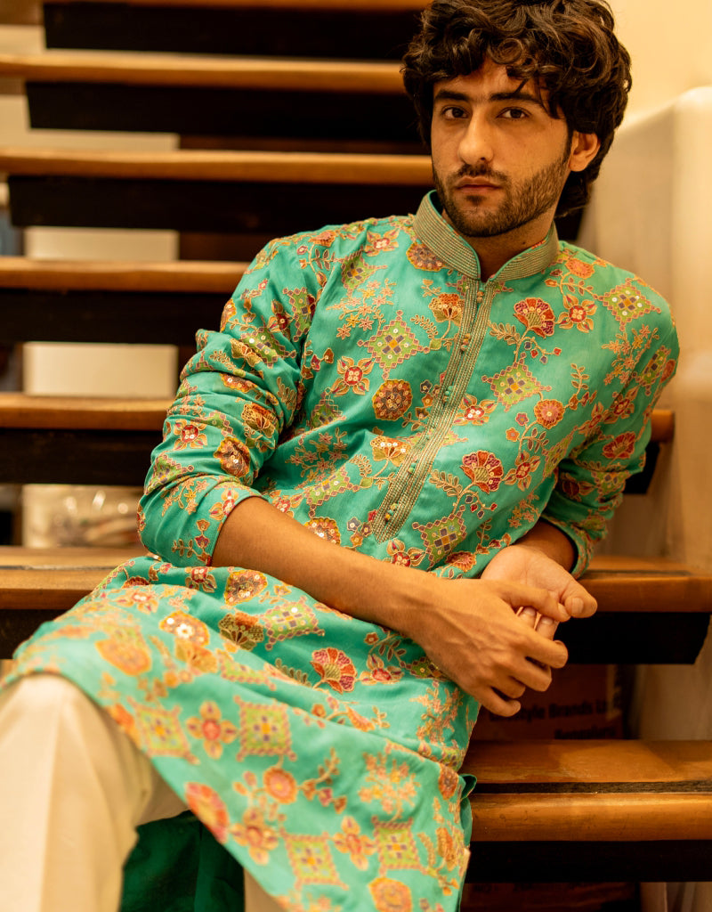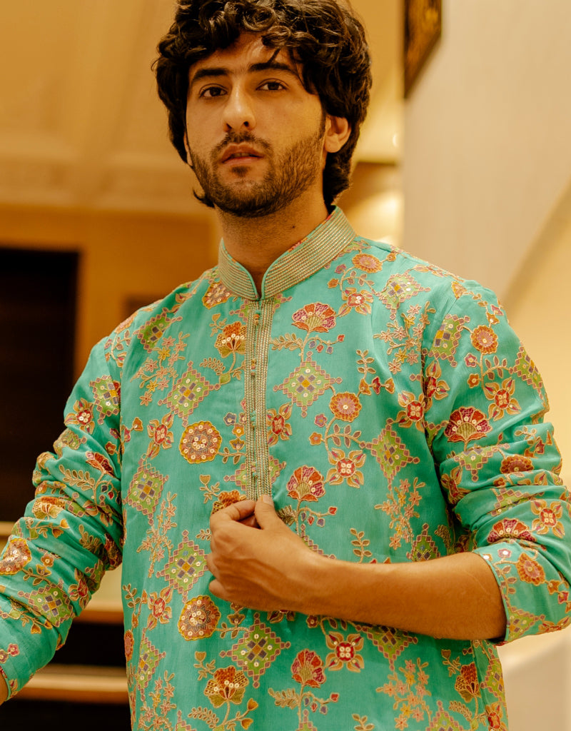 A turquoise blue kurta embellished with floral thread embroidery — youthful, intricate, and elegantly festive.